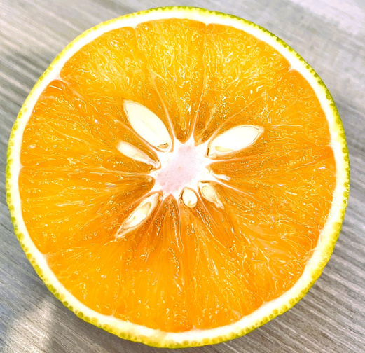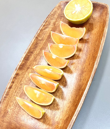 玫瑰橙果肉帶有花青素,帶有橙香與柚香,是無酸橙的一種(自然品種),適合不喜吃酸的朋友,由紅色轉橘黃色後甜度會提高,香氣足
