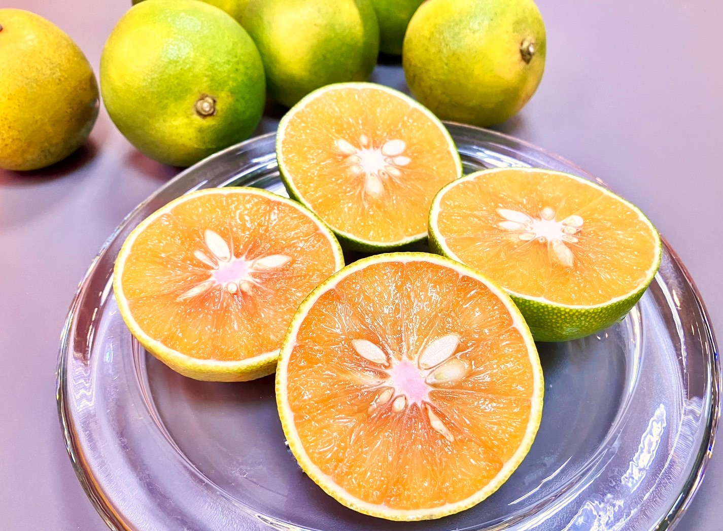 切開果實,鮮紅的果肉透著玫瑰色的光澤,果汁也不停的滴下來,這可不是葡萄柚,而是玫瑰橙,是柳丁中的頂極品種